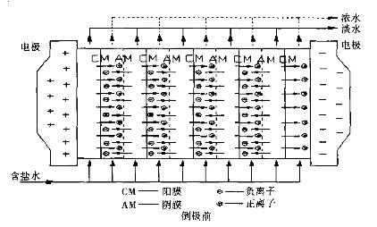 當向隔室通入鹽水后,在直流電場作用下,陽離子向負極遷移,通過陽離子交換膜而被阻擋在下一陰離子交換膜;陰離子向正極移動,通過陰離子交換膜而被阻擋在下一陽離子交換膜,從而使淡室中的鹽水被淡化,濃室(淡室相鄰的一對陰陽膜之間的空間)中的鹽水被濃縮。